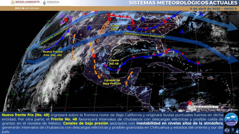 Para hoy, un nuevo frente frío (No. 49) se extenderá sobre la frontera norte de Baja California, originando lluvias puntuales fuertes en esa entidad. Por otra parte, el frente No. 48 se extenderá sobre el noreste del país en donde favorecerá intervalos de chubascos con descargas eléctricas y posible caída de granizo. Canales de baja presión asociados con inestabilidad en niveles altos de la atmósfera, generarán intervalos de chubascos con descargas eléctricas y posible granizada en Chihuahua, oriente y sur de México. Asimismo, se prevén temperaturas superiores a 35 ºC en 24 estados del país.