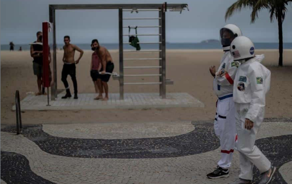 Los tapabocas, aparentemente innecesarios, pero de obligatorio uso en las calles de Río, hacen parte fundamental del atuendo de la original pareja durante sus paseos diarios.