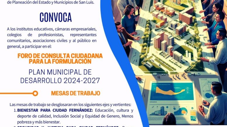 El Gobierno Municipal de Ciudad Fernández invita a todos los ciudadanos a ser parte del Foro de Consulta Ciudadana, un espacio diseñado para colaborar en la elaboración del Plan Municipal de Desarrollo 2024-2027. Este evento se llevará a cabo el próximo miércoles 27 de noviembre, a partir de las 5:00 p.m., en el Teatro Villa de Santa Elena.