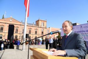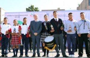Durante el evento que se realizó en la Plaza de Fundadores, acompañado por la presidenta del Sistema DIF en el estado, Lorena Valle Rodríguez y de los poderes Judicial y Legislativo, así como representantes del sector educativo, el mandatario estatal entregó reconocimientos a las y a los ganadores del 31º Concurso Estatal de Escoltas de Bandera y de la 29º Muestra Estatal de Bandas de Guerra.