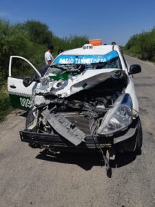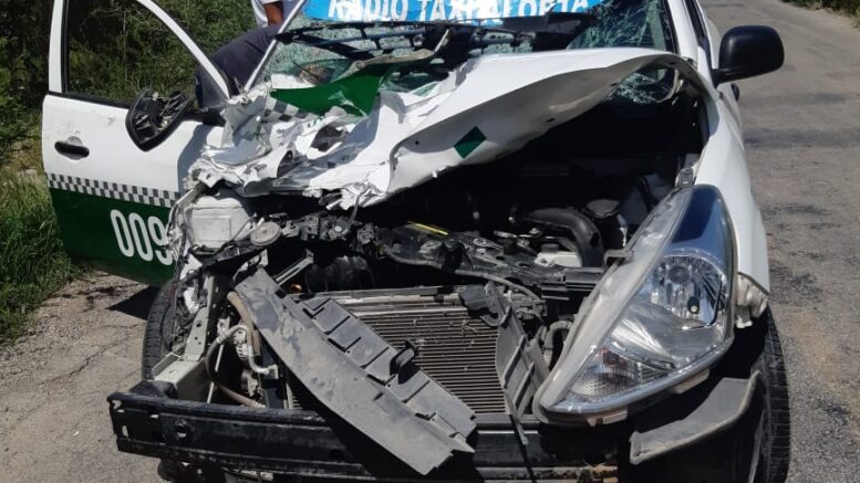 El taxi número económico 009 choco contra el animal causando daños al frente del vehículo de alquiler donde le pasajero que viajaba en la parte delantera del copiloto resulto lesionado quien fue trasladado en estado grave.