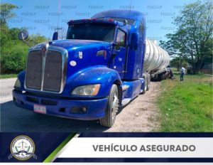 Asimismo, en el trayecto al municipio vallense, sobre la misma carretera, de norte a sur a la altura del ejido Montecillos observaron estacionado un tracto camión, color azul, con un remolque tipo pipa, color blanco, el cual se encontraba ladeado y al realizarse una inspección, se observó que los tres neumáticos externos de los tres últimos ejes traseros del lado del conductor, estaban dañados, así como la polvera y la base de la suspensión de aire, motivo por el cual, una vez realizadas las actas correspondientes, se procedió a su aseguramiento por su probable participación en el hecho de transito que se investiga.
