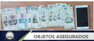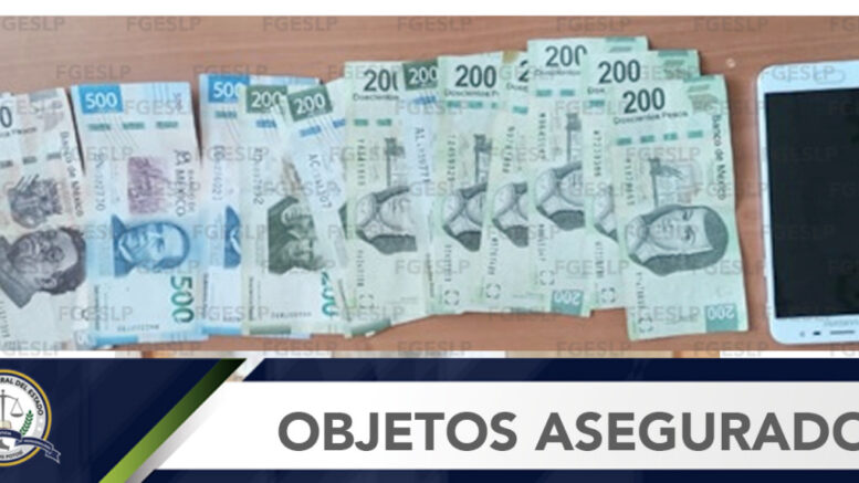 En el momento que se disponía a huir, fue asegurado por elementos de la PDI, quien previa identificación como agentes activos de la FGESLP le solicitaron descender de la unidad para realizarle una inspección corporal, encontrándole el paquete con varios billetes con denominación de 500 y 200 pesos.