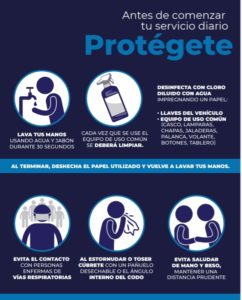 El equipo de uso común como llaves, radio, casco, deberá limpiarse utilizando cloro diluido en agua, así como el exterior e interior de las unidades, el personal deberá acatar todas las disposiciones emitidas por la Secretaría Salud.