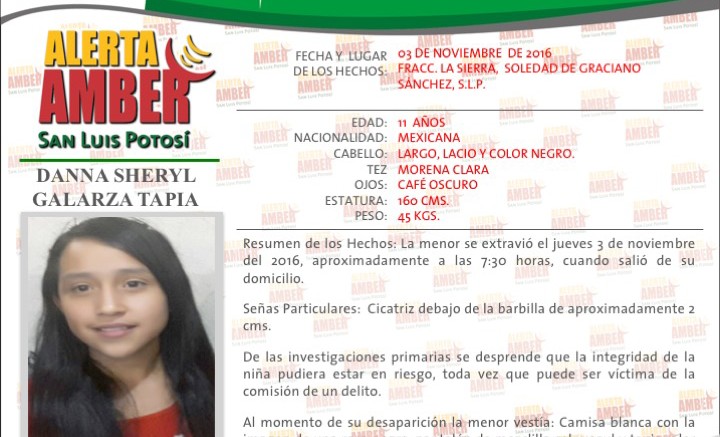 SLP.- La Procuraduría General de Justicia del Estado (PGJE) activó una Alerta Amber para localizar a la menor Danna Sheryl Galarza Tapia de 11 años de edad, misma que salió de su domicilio la mañana de este jueves 3 de noviembre de 2016, sin que haya regresado hasta el momento.