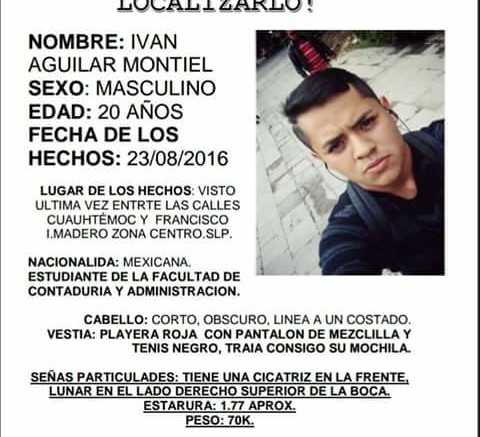 Familiares a través de un desplegado solicitan a la ciudadanía contribuya a la localización de Iván Aguilar Montiel, estudiante de la Facultad de Contaduría y Administración de la Universidad Autónoma de San Luis Potosí, quien fue visto por última vez el día de ayer por las calles Cuauhtémoc y Francisco I. Madero de la zona Centro.