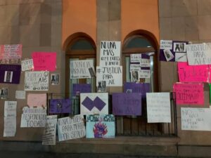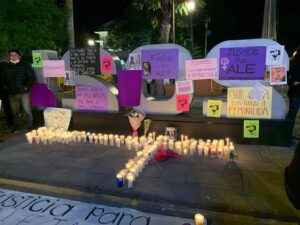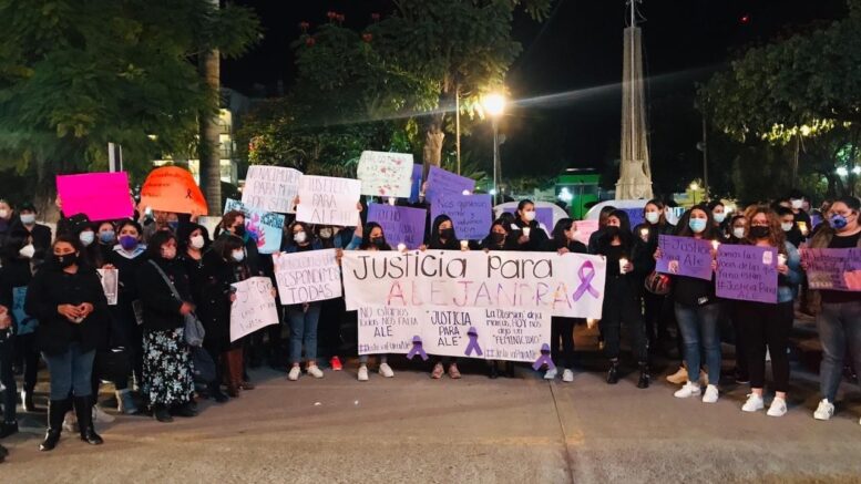 La noche del lunes la sociedad de Rioverde se manifestó frente a palacio municipal pidiendo justicia para Alejandra , joven que fue asesinada por un sujeto acosador la mañana del lunes en las afueras de la ciudad .