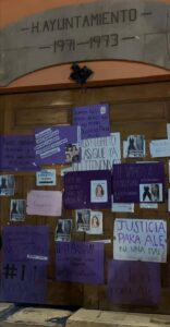 Hombres , mujeres y familias completas se unieron a la marcha por la calle principal del municipio deteniendo su lado frente a la presidencia municipal donde instalaron un altar con fotos de la joven quien deja a una pequeña huérfana .