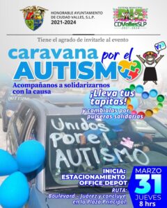 Ciudad Valles. SLP.- En el marco del Día Mundial de la Concientización sobre el Autismo, el Ayuntamiento de Ciudad Valles y el Sistema Municipal DIF en coordinación con el “Grupo Incluyente” y “Colectivo Mamis Trabajando” realizarán la 5ta Caravana Azul por la inclusión el día jueves 31 de marzo a las ocho de la mañana.