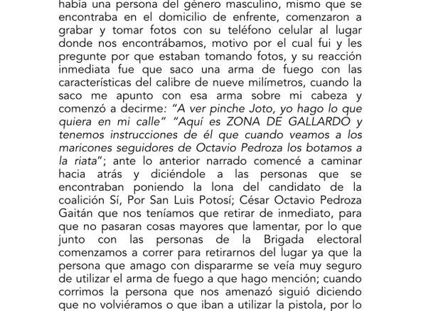 Según la denuncia presentada por el equipo jurídico del partido Acción Nacional y hecha llegas a esta redacción los brigadistas dieron a conocer el hecho que sucedio en la colonia antes mencionada , cuando un grupo de jóvenes realizaban la colocación de propaganda del candidato Ocatvio Pedroza, en la calle 71 donde se percataron de de un domicilio marcado con el número 105 un sujeto comenzó a grabar y tomar fotografías, al cuestionarlos del porque de su insistencia de grabar y tomar gráficas , un sujeto saco de entre sus ropas un arma de fuego con la cual apuntando al grupo comenzó a insultarlos diciendo que era un territorio o “zona Gallardo ” y tenemos instrucciones de no permitir cualquier publicidad de otro candidato que no sea el Pollo ,no sin antes recibir varios improperios y amenazas del presunto simpatizante.