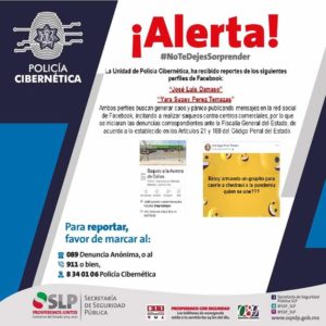 Se pide a la sociedad en general realizar los reportes de esos perfiles al 089 Denuncia Anónima, la Línea de Emergencias 9-1-1 y al 44 48 34 01 06 Policía Cibernética, para iniciar con las denuncias correspondientes ante la Fiscalía General del Estado, de acuerdo a lo establecido en los artículos 21 y 188 del código Penal del Estado.