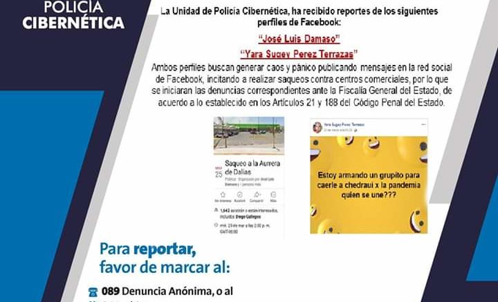 La Policía Cibernética exhortó a la población a no crear o seguir falsos perfiles que generen pánico y caos social en las redes sociales, incitando a los saqueos de centros comerciales.