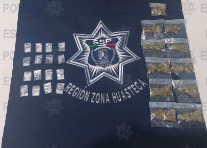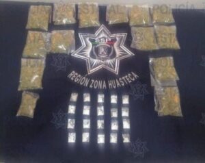 En primer lugar, en el Municipio de Tanquián de Escobedo es detenido sobre la calle Lerdo de Tejada en la Colonia Alto Las Flores, un sujeto por la presunta posesión de 16 bolsas plásticas que en su interior contenían un polvo granulado en color blanco con las características propias de la droga sintética conocida como “cristal”, con un peso total de 4.3 gramos y además 11 bolsitas transparentes, que en su interior contenían una hierba seca en color verde con las características propias de la marihuana, dando un peso total de 29.8 gramos.