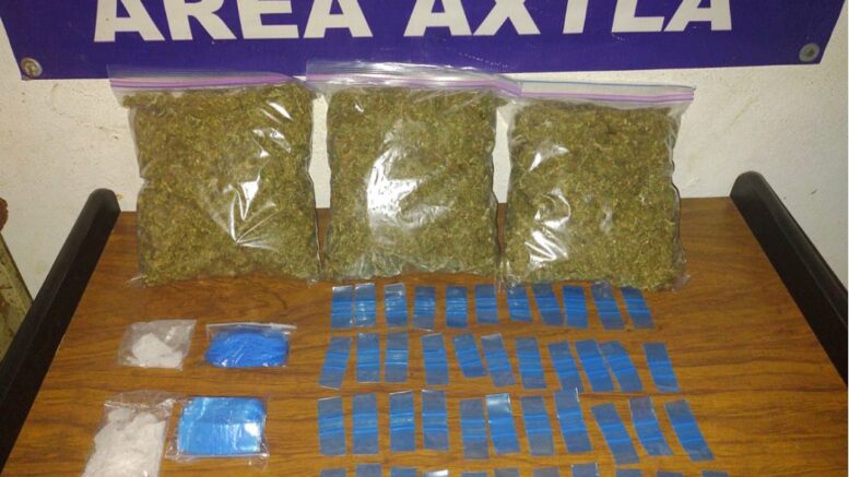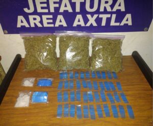 En la carretera estatal Axtla-Coxcatlán, Kilometro 50, Barrio la Libertad y como parte de los dispositivos implementados en dicho municipio, elementos de la Policía Estatal llevan a cabo la detención de Silverio G. de 49 años de edad y Filiberto G. de 34 años de edad por la posesión de 1.551 kilogramos de marihuana, 02 dosis de cristal con un peso de 36 gramos y 03 paquetes conteniendo bolsas resellables de las utilizadas para confeccionar dosis de droga para el narcomenudeo.