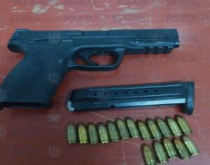 Fue en las calles de Mariano Arista y Melchor Ocampo que se llevó a cabo el arresto de quien dijo llamarse Benito de 33 años de edad, luego de ser sorprendido en poder de un arma de fuego Smith & Weson calibre .9 milímetros con un cargador abastecido con 17 cartuchos útiles.