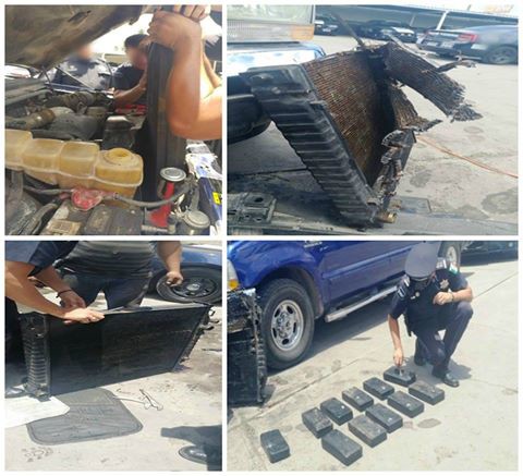 Durante recorridos de inspección y seguridad en la carretera San Luis Potosí-Matehuala, ubicamos un vehículo que transportaba ocultos en el radiador 10 paquetes de material cristalino, con las características de la droga cristal así como un paquete de polvo color blanco y granulado con las características de la cocaína. Su peso aproximado fue de 21 kilogramos.