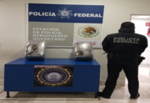 Durante acciones de inspección en el Aeropuerto Intercontinental de Querétaro, se detecto una caja de color café con dos paquetes rectangulares en su interior se trataban de más de 20 kilos de probable marihuana.