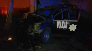 Elementos de la dirección de seguridad pública municipal presuntamente alcoholizados chocaron la madrugada de hoy una patrulla contra la cortina de un negocio y derriban el poste de energía eléctrica con transformador, dejando a un sector de la ciudad sin luz.