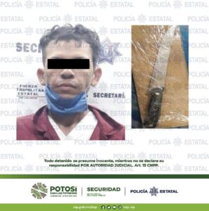 SAN LUIS POTOSÍ, SLP.- Mediante los operativos preventivos llevados a cabo para inhibir la comisión de hechos delictivos, policías estatales llevaron a cabo la detención de un masculino, por el presunto delito de portación de un arma blanca, en la colonia Estrella de Oriente.