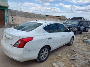 Un Nissan, tipo Versa, modelo 2012, color blanco, sin placas de identificación, acumulador ni llanta de refacción se aseguró sobre calle Ferrocarrilera de la colonia Rancho Blanco. Contaba con reporte de robo el 04 de marzo de 2022, en la colonia Haciendas de Jacarandas.