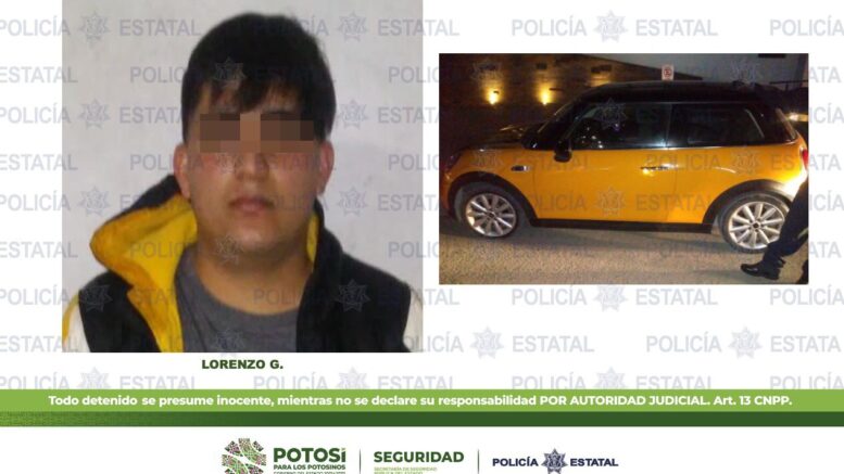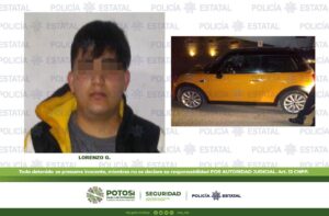 Los hechos se suscitaron durante los dispositivos preventivos en la calle Eugenio Garza Sada y Avenida Tercer Milenio, en la colonia Lomas del Tecnológico, donde elementos de seguridad Estatal detuvieron a Lorenzo G., de 21 años de edad, después de que se le aseguró un automóvil marca BMW, tipo Mini Cooper, modelo 2017, color naranja, con placas de esta entidad, el cual fue reportado como robado en Morelia, Michoacán.