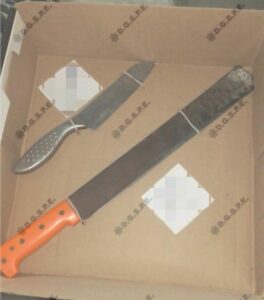 El sujeto al ver a los Policías Estatales dejó abandonada le unidad, subiéndose al techo de una vivienda, observando a simpe vista que portaba un machete y un cuchillo, solicitándole a través de comandos verbales que arrojará las armas prohibidas, procediendo a la detención de Luis C., de 21 años de edad.