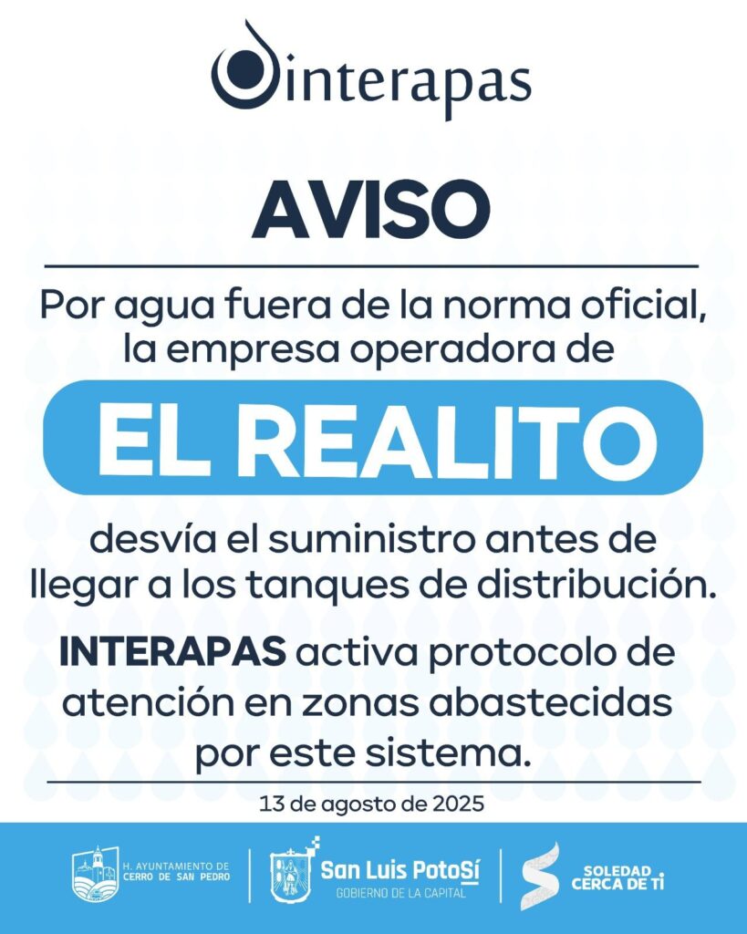 El organismo implementó su protocolo de atención, que incluye acciones para mitigar la afectación zonas abastecidas por “El Realito”, y continuará informando a través de sus canales oficiales.
