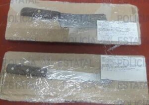 En la Avenida Ricardo B. Anaya y la calle Manuel Herrera en la colonia Manuel José Othón, los Estatales detuvieron a Roberto de 22 años de edad y a Jesús de 40 años de edad a quienes se les aseguraron dos cuchillos; uno de 19 y otro de 26 centímetros.