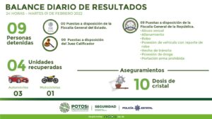 Los agentes Estatales se trasladaron a la carretera estatal Charcas-Santo Domingo, lugar en donde fue detenido José C., de 53 años de edad, después de que fue señalado como presunto responsable de un hecho de tránsito al impactar su camioneta marca Ford, tipo pick up, color guinda y atentar contra la seguridad vehicular.