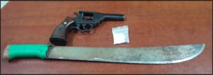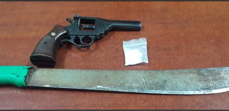 Al llegar a la calle Cerro de la Silla, los oficiales detuvieron a Jorge R., después de que la agraviada refirió que el presunto la había agredido física y verbalmente. Así mismo, al hombre se le aseguró un arma de fuego, tipo revólver, un machete y una dosis de cristal.