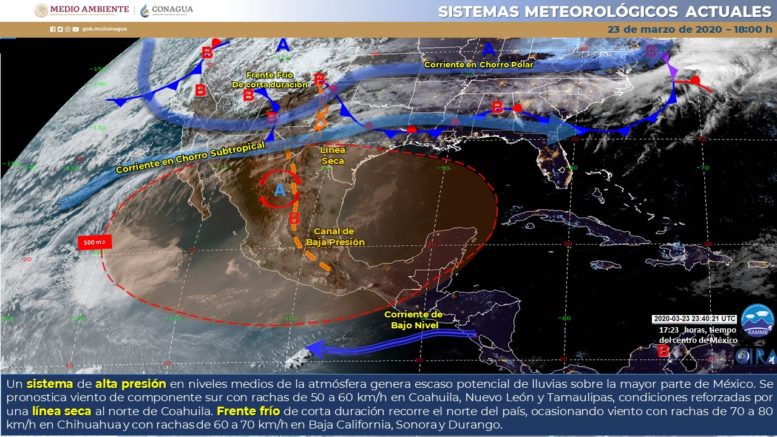 Para mañana, un sistema de alta presión en niveles medios de la atmósfera mantendrá el ascenso de las temperaturas y escaso potencial de lluvias sobre la mayor parte de México, a excepción del noroeste del país. Mientras que el frente frío de corta duración recorrerá el norte y noreste del territorio nacional, generando vientos fuertes con rachas de 50 a 60 km/h en dichas regiones, se prevé que al final del día, el sistema entre en etapa de disipación, dejando de afectar al del territorio nacional.
