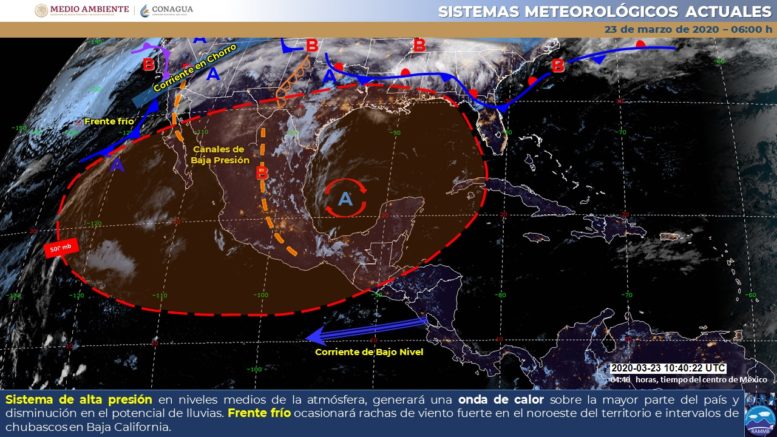 Valle de México: Cielo despejado con incremento de nublados por la tarde, sin lluvia en la región. Viento del este y noreste de 10 a 25 km/h con rachas de 35 km/h. En la Ciudad de México se pronostica una temperatura máxima de 28 a 30°C y mínima de 12 a 14°C. Para el Estado de México temperatura máxima de 27 a 29°C y mínima de 11 a 13°C.