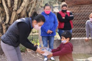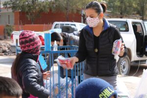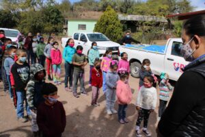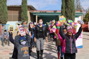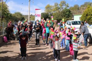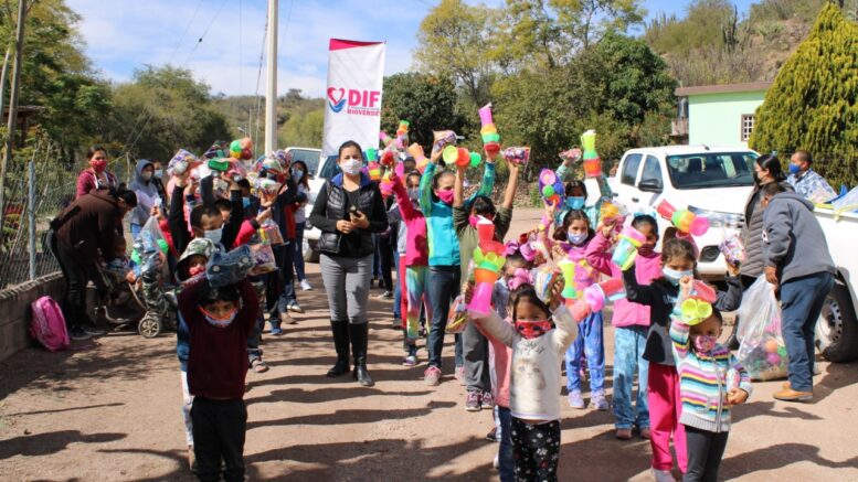 Fue la Presidenta del DIF Municipal, Rosa Isela Konishi Romero, quien acompañada de la Coordinadora, Olga Guadalupe Gutiérrez Ávila y de la Delegada del Instituto Nacional de las Personas Adultas Mayores (INAPAM), Ruth Galván Martínez, realizaron la entrega directa de bolsitas de dulces y de juguetes a los menores de estos poblados.