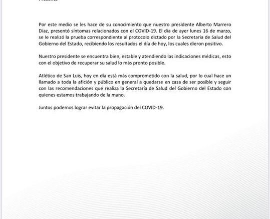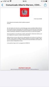 Esta misma tarde la directiva dl club Atlético de San Luis dio a conocer en un comunicado a medios de comunicación de que su presidente Alberto Marrero después de su viaje a España había dado positivo la prueba que se le practicara y que de forma voluntaria se aisló en su domicilio donde se tienen todos los protocolos del caso .
