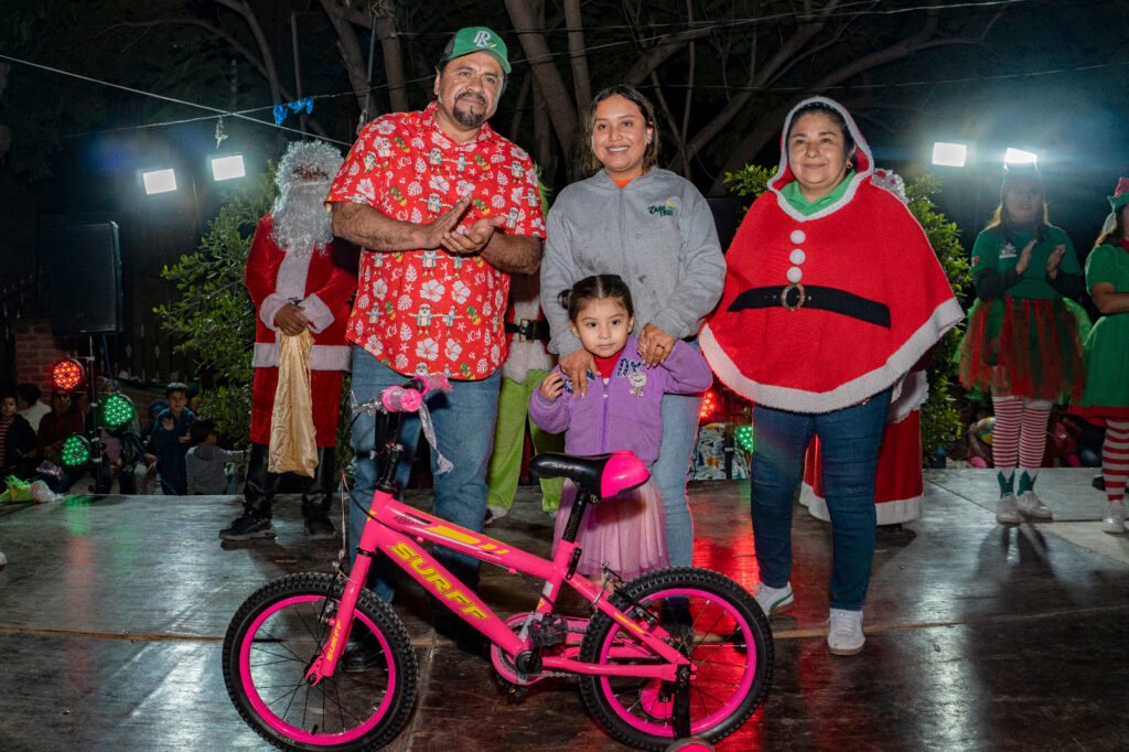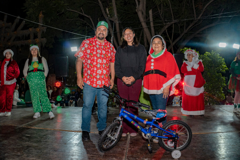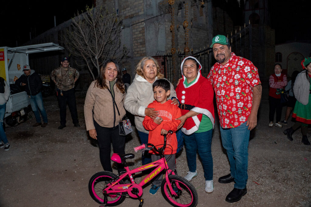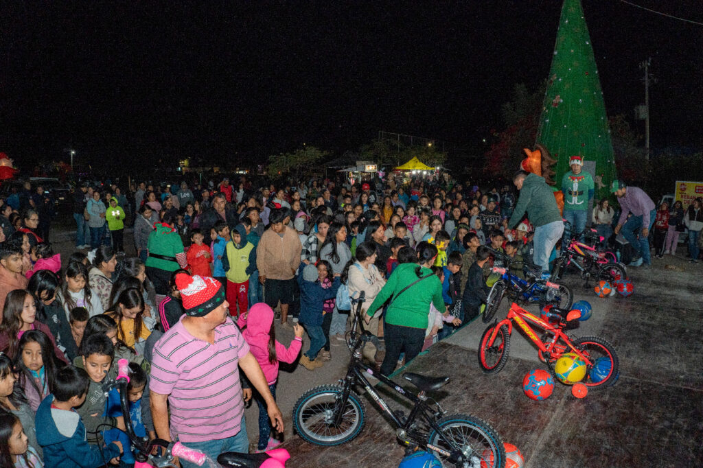 El cierre de la jornada tuvo lugar en la comunidad de Ojo de Agua de Solano, donde se llevó a cabo el encendido del Árbol Navideño, un momento emotivo que reunió a familias enteras, en este marco, se entregaron balones y una gran cantidad de bicicletas para las y los niños asistentes, además de ofrecer pizza, sorpresas y actividades de convivencia familiar.