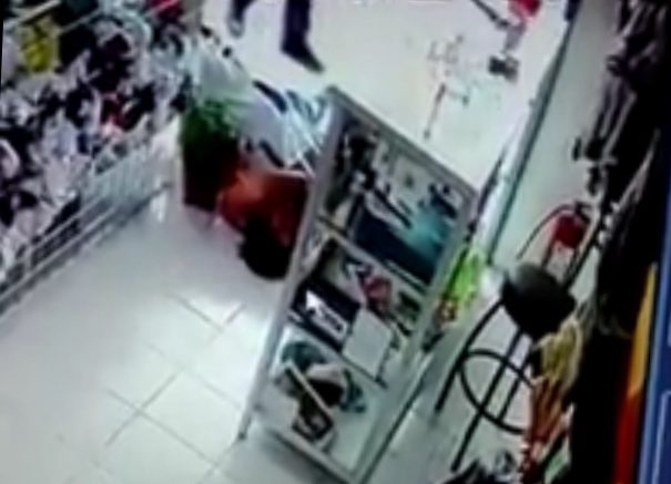 La mañana de hoy a través de las redes sociales circula un video de una mujer que está observando los aparadores de una tienda de deportes en el centro de la ciudad , cuando por la parte trasera se puede observar como un hombre vestido de policía (privada) golpes y de un solo tajo deja a la mujer desmayada .