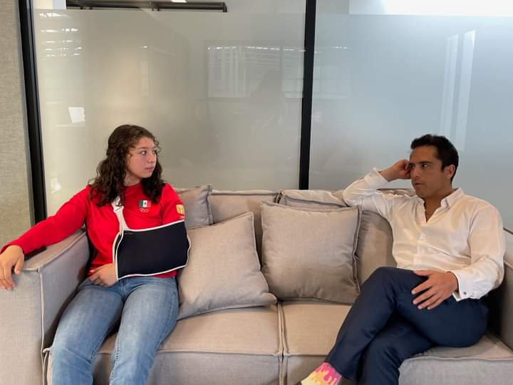 San Luis Potosí, San Luis Potosí a 4 de noviembre de 2024. Aun con las huellas de la batalla la deportista potosina especializada en karate Do, Valeria Juárez visitó en pasados días las instalaciones de las oficinas de Ricardo Cordero, Valeria aun con la férula en el hombro, lesión que le originó el combate en Venecia que le entregaría el bronce, no dejo pasar más tiempo para mostrarle la presea al piloto seis veces campeón de la carrera panamericana.