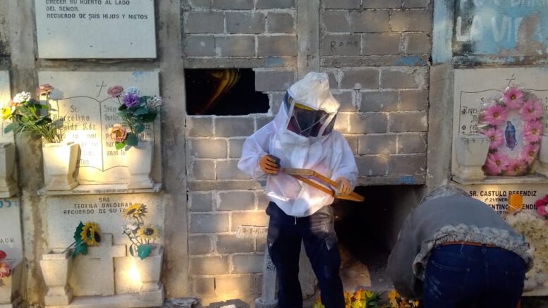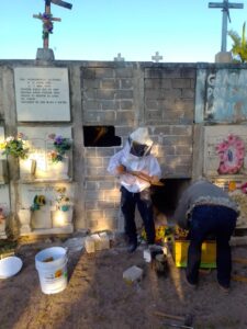 Se llevo acabó el día de hoy jueves a las 6:30 el retiro de una colmena que ponía en riesgo a los visitantes al campo santo, para posteriormente trasladarlos a un mejor hábitat y así prevenir los riesgos ante las ciudadanía concurrente cómo para también seguir cuidando a los polinizadores.
