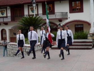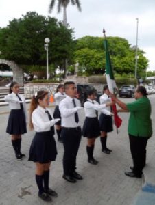 Alumnos y personal docente del Colegio de Bachilleres Plantel 24, encabezaron este lunes 10 de Septiembre los Honores a los Símbolos Patrios en la Plaza Principal de Ciudad Valles.
