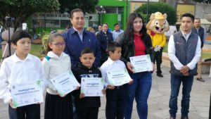 Fue durante la ceremonia de honores a la bandera, efectuada este lunes por la mañana, cuando el Alcalde José Ramón Torres García, de manera conjunta con la Presidenta del Sistema Municipal para el Desarrollo Integral de la Familia, Rosa Isela Konishi Romero; los Enlaces de Conafor, María Guadalupe Díaz Cabrales, y Enrique Martínez Tobías, además del titular en esta región de la Comisión Nacional de Fomento Educativo, Víctor Hugo Nava Luna, y la Directora de Ecología Municipal, Edith Amador Blanco, efectuaron la entrega, primeramente de la premiación por parte de la Comisión Nacional Forestal.