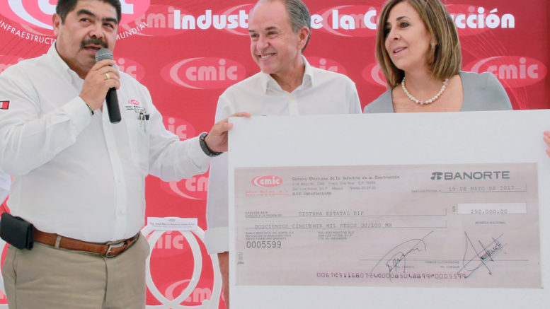 En el evento, la CMIC en San Luis Potosí entregó a beneficio del DIF estatal un cheque de 250 mil pesos, gracias al convenio firmado con el Gobierno del Estado, de las aportaciones de los constructores formales potosinos con lo que se fortalecerá la labor social que se lleva a cabo.