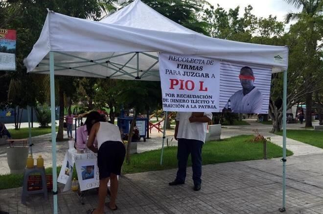 “Recolecta de firmas para juzgar a Pío L. Por recaudación de dinero ilícito y traición a la patria”, se estableció en diversas cartulinas colocados en los stands.
