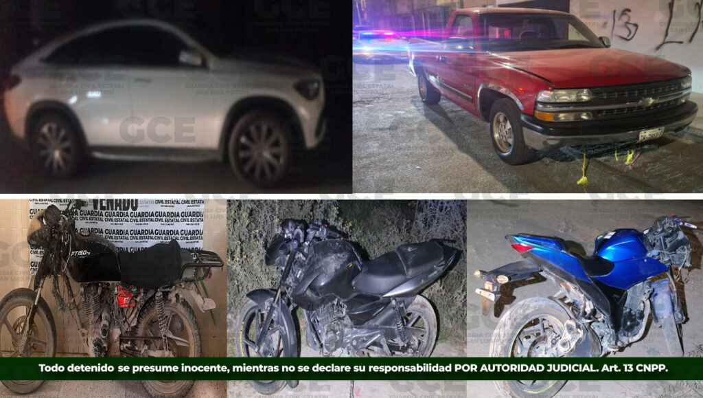 San Luis Potosí, S.L.P.- La Guardia Civil Estatal (GCE) de San Luis Potosí ha intensificado sus operativos de seguridad, logrando la detención de tres individuos por el probable delito de tripulación de vehículos con reporte de robo, además de la localización y aseguramiento de otras cinco unidades robadas en distintos puntos del estado.