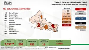 Los 298 nuevos casos están en el rango de 1 a 85 años de edad y se consideran 296 casos adquiridos en transmisión local y 2 foráneos. Los 16 lamentables decesos son 10 hombres y 6 mujeres, con residencia en la capital (6), Ciudad Valles (2), Soledad (2), Matehuala, Guadalcazar, Mexquitic, Tierra Nueva, Salinas y Tamzunchale. Los decesos tenían factores concomitantes de riesgo como edad, diabetes, hipertensión, enfermedad pulmonar y tabaquismo.