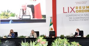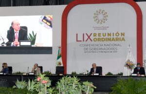 San Luis Potosí, SLP, 19 de agosto 2020.- El presidente de la Conferencia Nacional de Gobernadores (Conago) y Gobernador de San Luis Potosí, Juan Manuel Carreras López, y la Secretaria de Gobernación, Olga Sánchez Cordero, encabezan la LIX Reunión Plenaria de este organismo, que inició con una reunión de 31 mandatarios del país con integrantes del gabinete legal y ampliado del Gobierno de México, en donde se abordarán temas en salud, economía e impulso social, en la que participa la.
