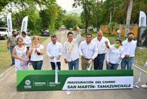 En el municipio de Tamazunchale, el jefe del Ejecutivo inauguró frente a cientos de habitantes la rehabilitación del camino San Martín Chalchicuautla- Tamazunchale con una inversión de 16 millones de pesos, con los que se realizaron acciones de bacheo profundo y la repavimentación con carpeta asfáltica en 12 kilómetros de longitud.