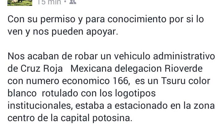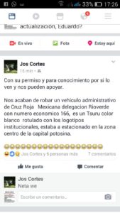A través de las redes sociales se pudo saber del robo toda vez que se pedía la colaboración de los usuarios para dar con el paradero del vehículo propiedad de la  cruz roja Rioverde.