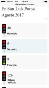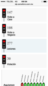 Para la organización semaforodelictivo.com el estado de San Luis Potosí se encuentra en “rojo” destacando los delitos de homicidio ,violaciones ,robo a vehiculos ,lesiones,robos a casa habitación y lesiones .