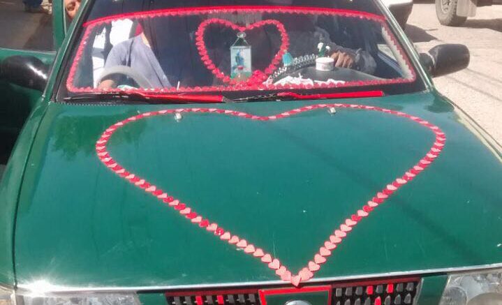 un chofer de un taxi de la ruta a la comunidad de Llanitos dio la nota del día al arreglar su vehículo con detalles alusivos al amor y la amistad