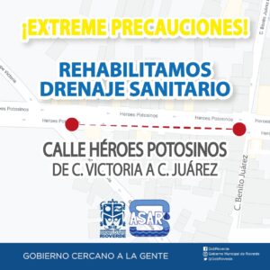 A efecto de prestar un mejor servicio a la población; los Servicios de Agua y Saneamiento Ambiental de Rioverde, llevan a cabo la rehabilitación de la línea de drenaje en el costado sur de la Avenida Héroes Potosinos, en su tramo que corresponde de calle Victoria a Benito Juárez, situación que obliga al cierre momentáneo del tráfico vehicular por el sector.
